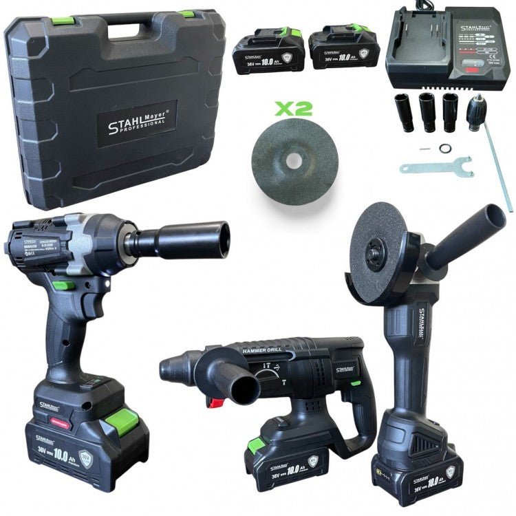 Акумулаторен комплект 4в1 , гайковерт-винтоверт , ъглошлайф , перфоратор 36v 10.0A , STAHLMAYER BLACK PRO