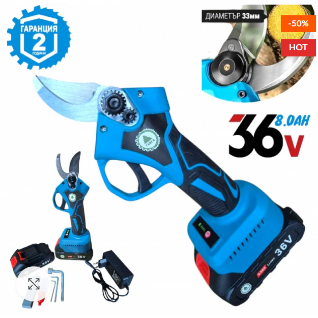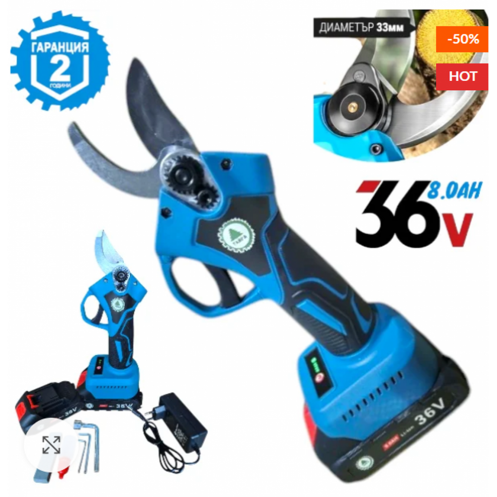 Акумулаторната лозарска ножица за рязане на лозови пръчки, клони, храсти и цветя. Диаметър на рязане е 33 мм.