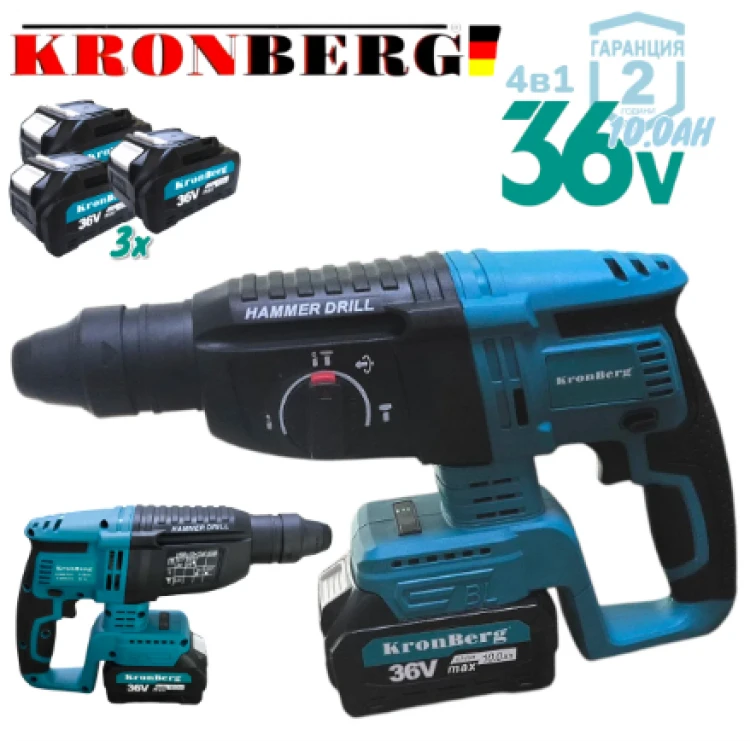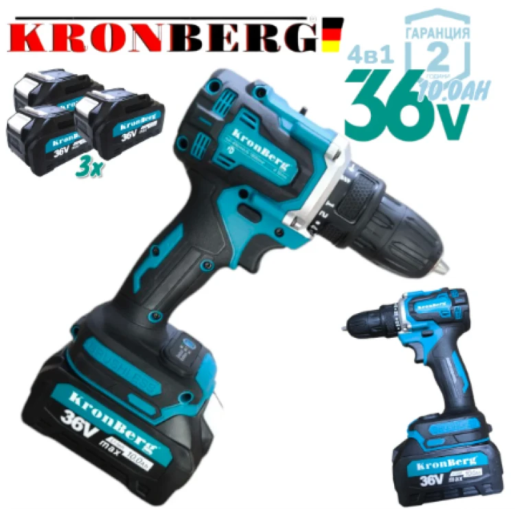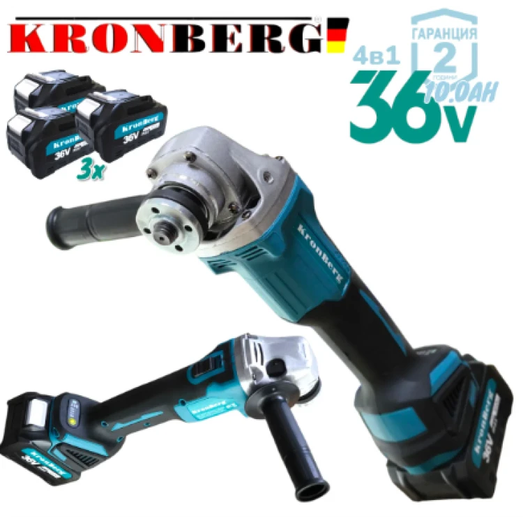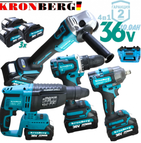 4в1 АКУМУЛАТОРЕН БЕЗЧЕТКОВ КОМПЛЕКТ Комбиниран Безчетков Акумулаторен Гайковерт-Импакт + Безчетков Акумулаторен Перфоратор + Акумулаторна Безчетков Ъглошлайф 125мм + Акумулаторен Ударен Безчетков Винтоверт 36V KRONBERG + 3 броя Батерии 36V 8.0AH Зарядно устройство + Куфар за лесно транспортиране