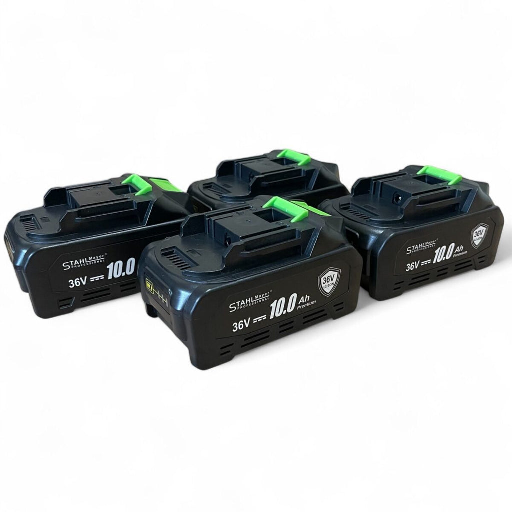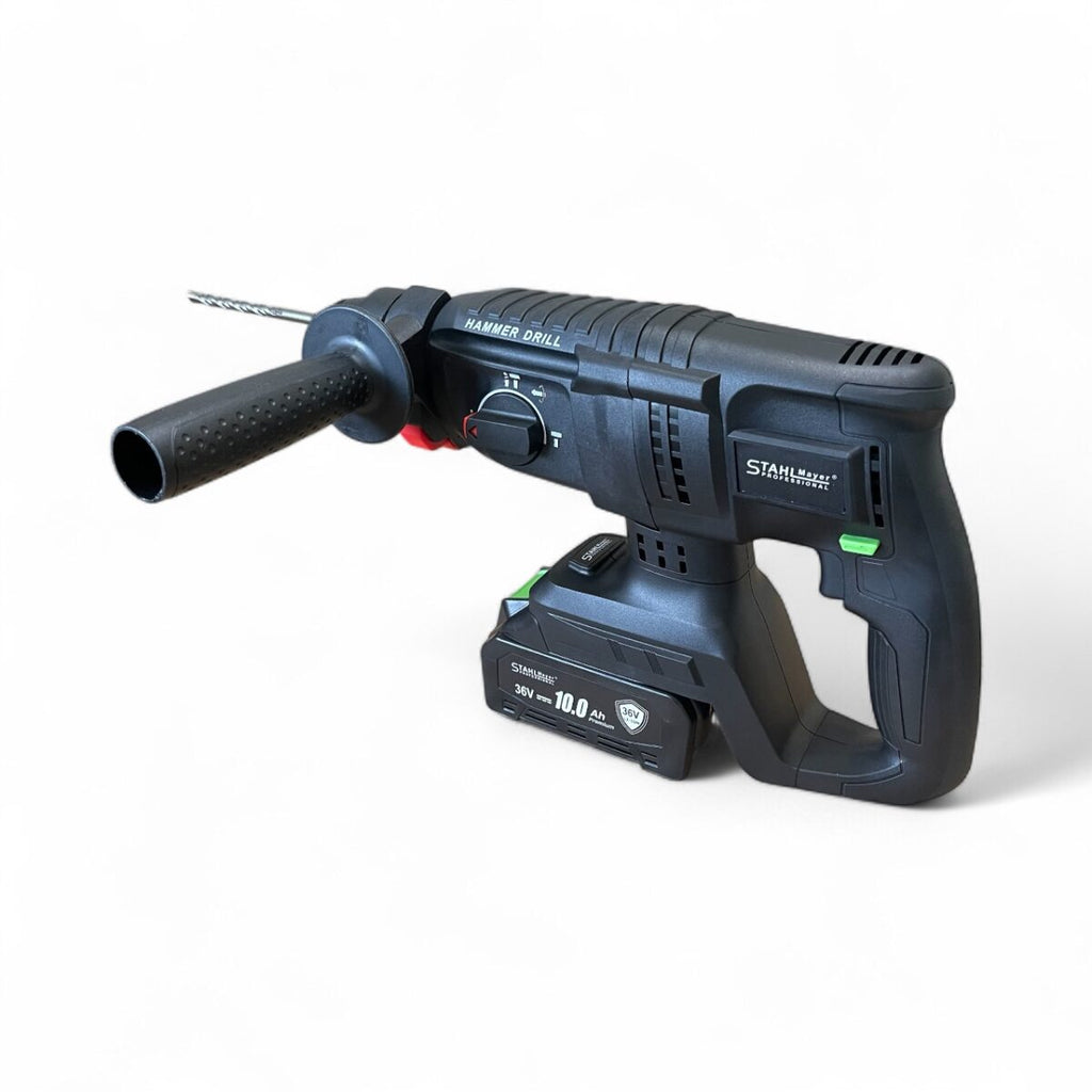 Комплект 7 в 1 от акумулаторен перфоратор, винтоверт, гайковерт, ъглошлайф, саблен трион , верижен трион  и LED лампа 36V 10Ah - с 4 батерии и  части в куфар StahlMayer Black