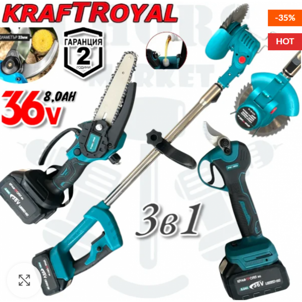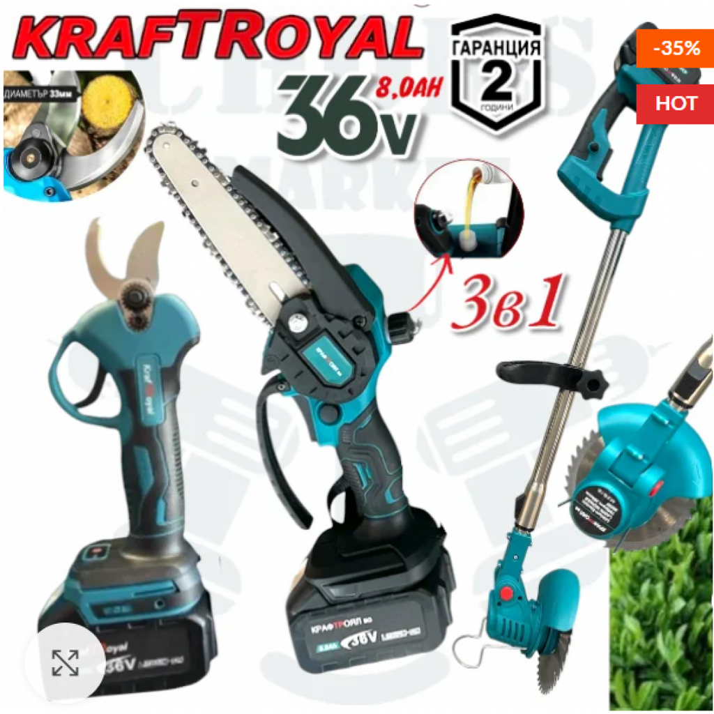 Комплект от акумулаторна лозарска ножица, мини верижен трион с 15 см шина, маслен филтър, 2 вериги и акумулаторен тример за трева 3 в 1 36V 8Ah KraftRoyal