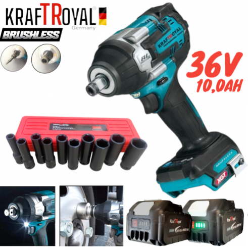 Безжичен Акумулаторен Безчетков Комбиниран Ударен Гайковерт/Импакт KRAFTROYAL 36V 8.0AH 2 Броя Батерия Зарядно Устройство Куфар + Ударни Ковани Вложки KRAFTROYAL 10-24мм 10 части в куфар