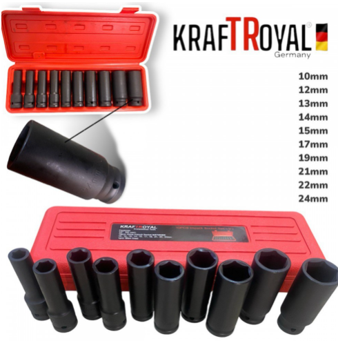 Комплект от 10 Удължени Ковани и Оксидирани Ударни Вложки KRAFT ROYAL на 1/2″ в здрава полимерна кутия