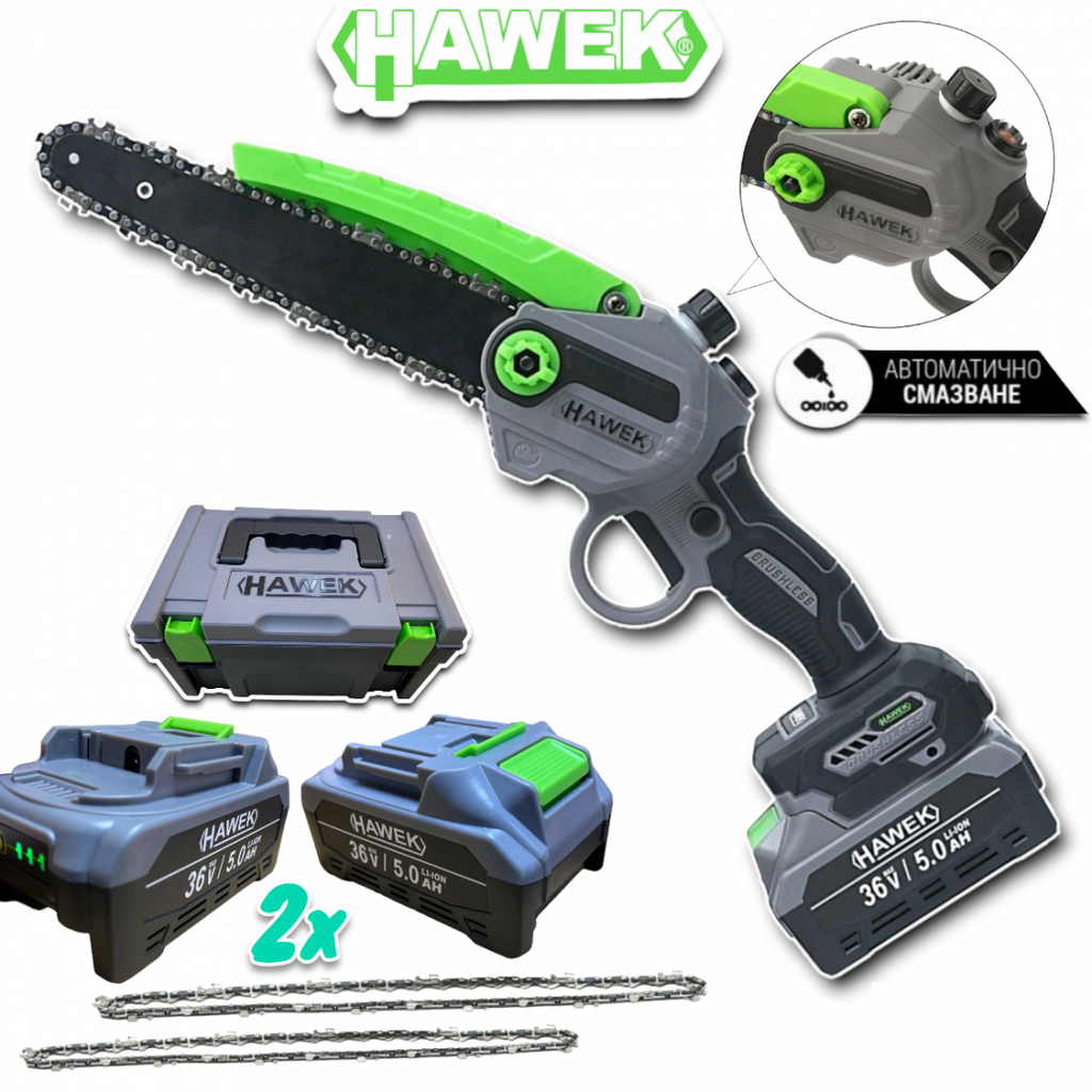 Акумулаторна Резачка за Клони 36V 5,0AH HAWEK Трион с Казанче Автоматично Смазване на Веригата 20см 2 вериги 2 Батерии