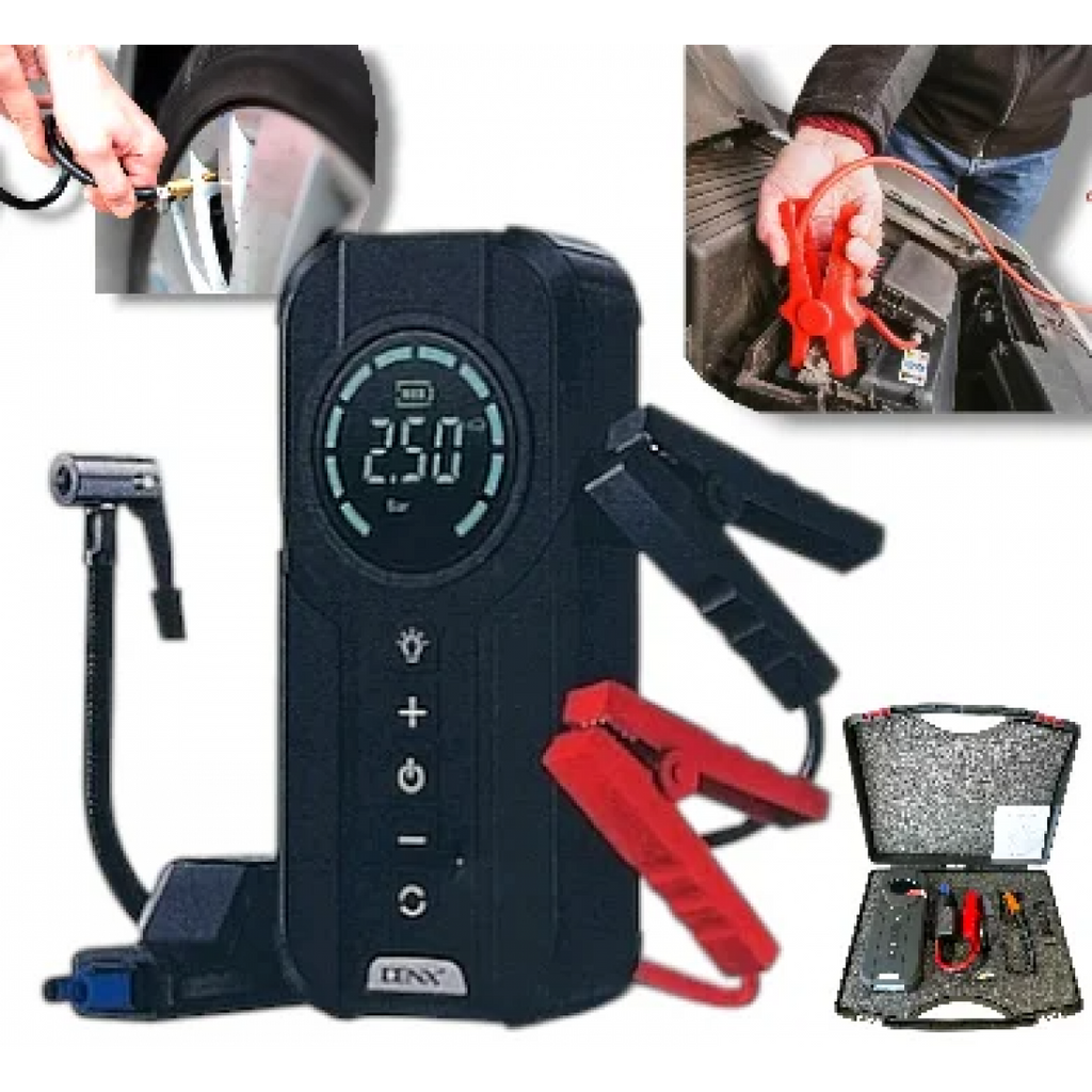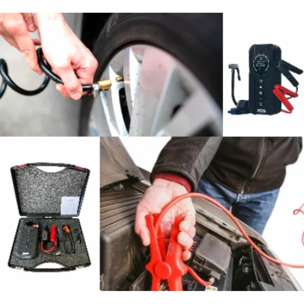 4в1 Стартерер за Акумулатор Компресор за Помпане на Гуми предназначен за лесно запалване на кола при разреден акумулатор и студено време разполага със дисплей .
