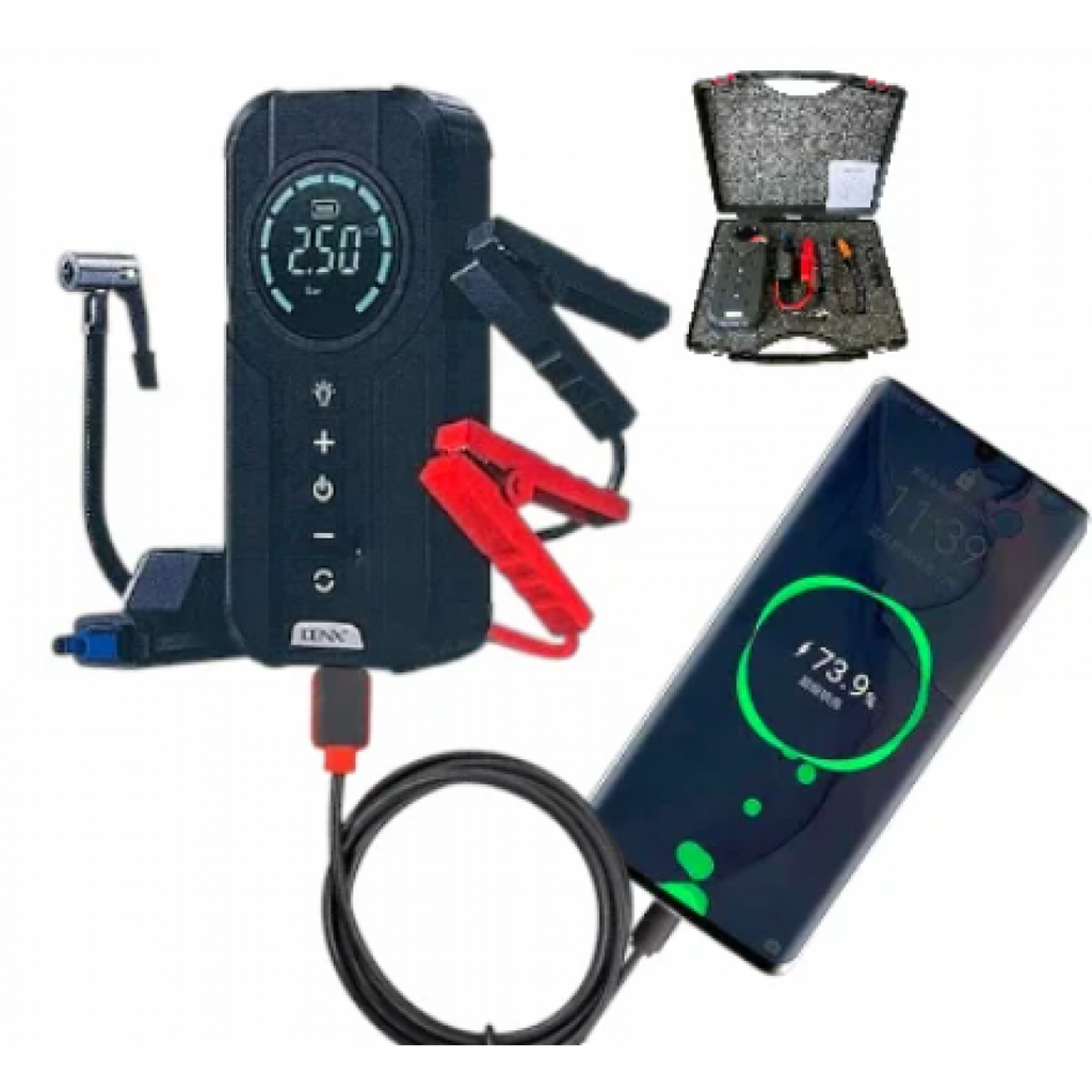 ✔️Може да се използва като стартер за стартиране на колата. ✔️Може да напомпва гуми като помпа за напомпване. ✔️Може да се използва като преносима батерия за зареждане на електронни устройства. ✔️Освен това има функция за аварийно осветление.