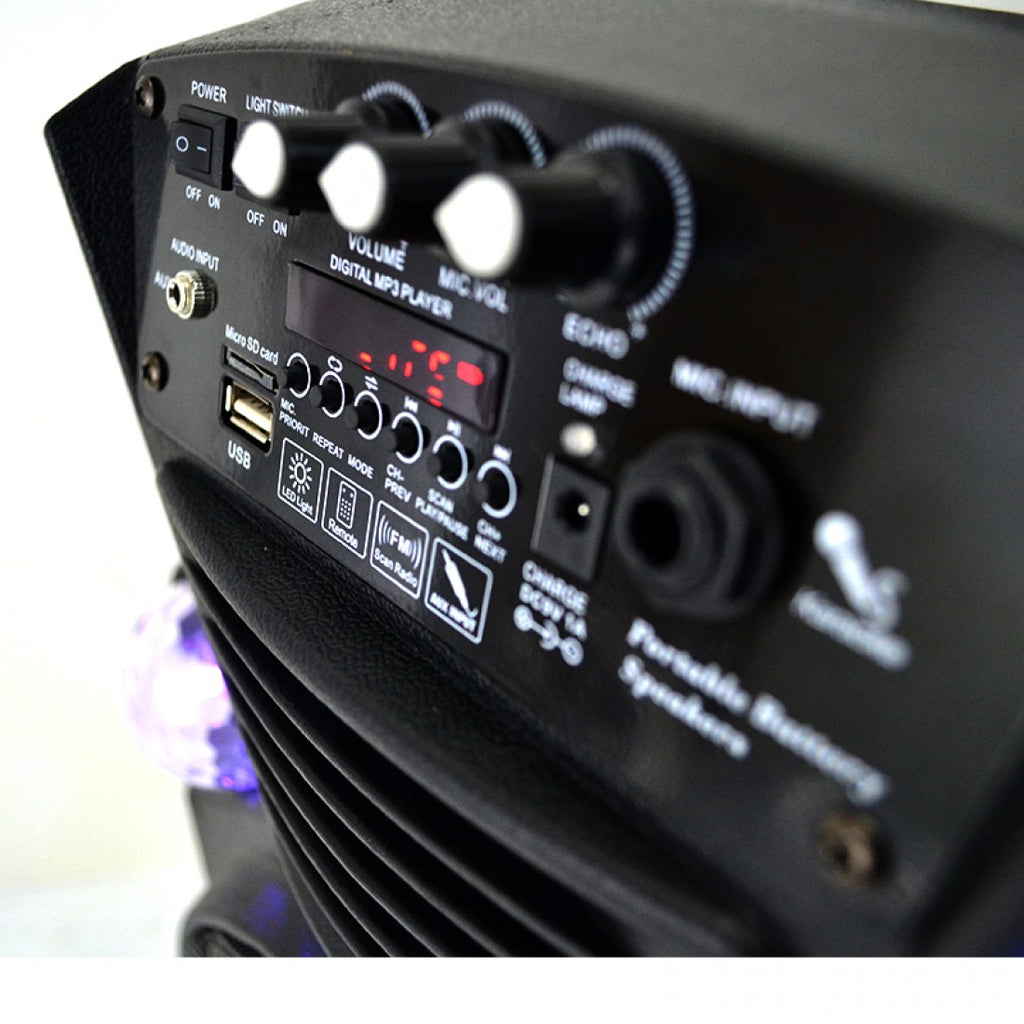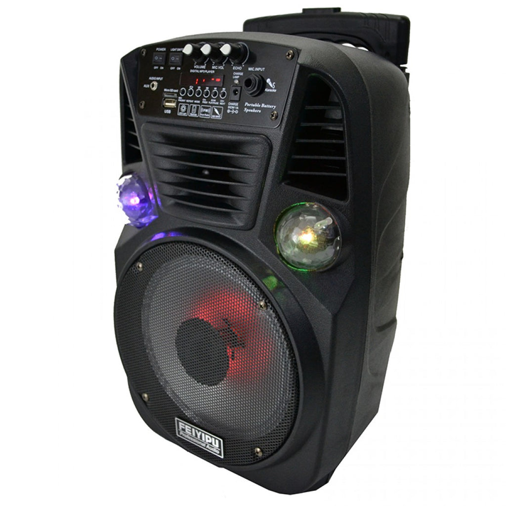 Уредбата за караоке FEIYIPU ES-8 разполага с вграден акумулатор, безжичен микрофон и възпроизвежда файлове Мр3 формат от USB флашка или SD карта, BLUETOOTH, РАДИО + СВЕТЛИННИ LED ЕФЕКТИ. Караоке тонколоната е особено подходяща за улични музиканти, купони, празненства, презентации и др. Системата за караоке е много удобна и за ползване на места където няма електричество, тъй като е с вградена акумулаторна батерия.
