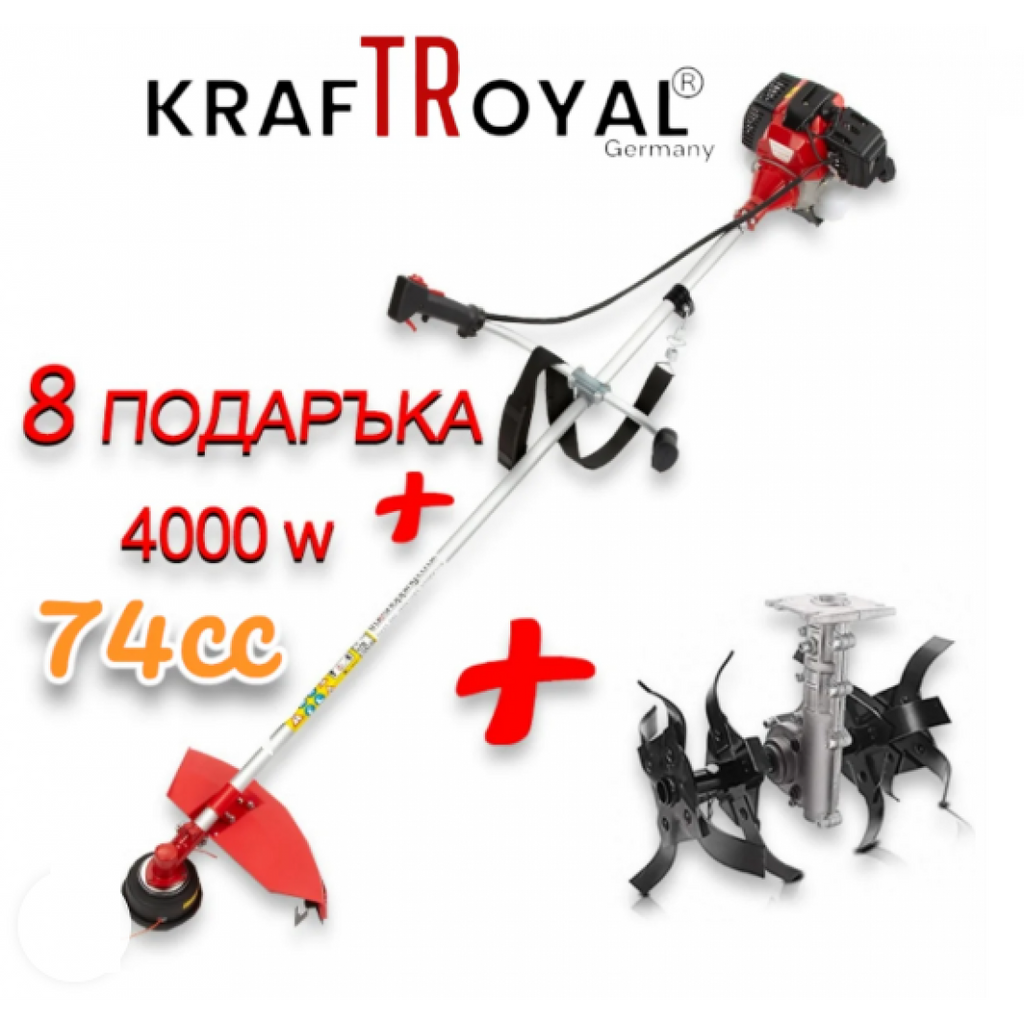 Комплект бензинов тример за трева KraftRoyal 74cc + приставка фреза