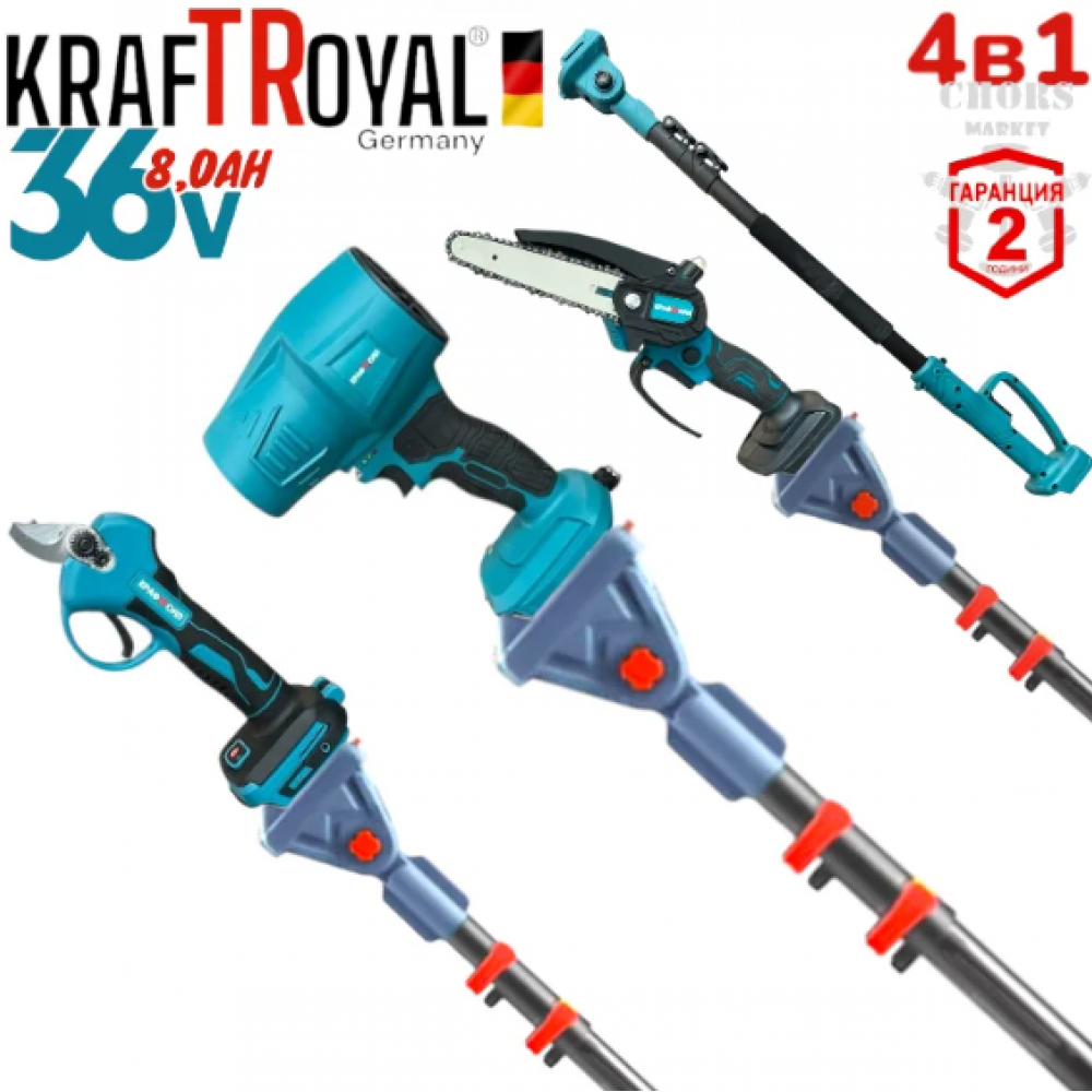 Градински Комплект 4в1 Акумулаторна Духалка за Листа 36V Акумулаторна Резачка за Клони 36V с Автоматично Смазване на Веригата Лозарска Ножица 36V и Телескопичен Прът 2.5м KRAFTROYAL с 2 Батерии