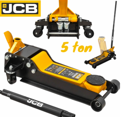 Професионален сервизен крик на марката JCB с товароподемност 5 тона с 2 помпи усилена конструкция, крикът е снабден с педал за бързо повдигане.