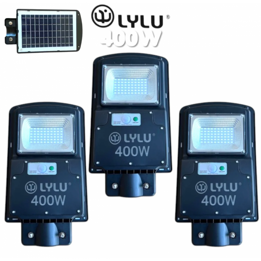 Улична соларна лампа Lylu 400W. Осветителното тяло е подходящо за монтаж на височина 3-5м. и площ на осветяемост до 160кв.м. С помощта на вградения соларен панел, акумулаторните батерии с висок капацитет и 2 секционните SMD прожектори, лампата е напълно автономна.