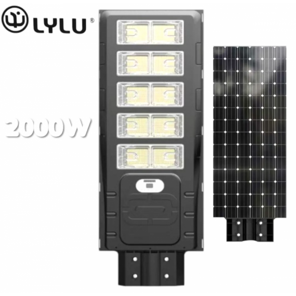 Соларна лампа LYLU 2000W е предназначена за външно осветление на открити пространства, където има необходимост от надеждно осветление, но липсва електрозахранване. Често се използва за осветление на улици, паркове, пазари, градински пътеки, паркинги, гаражи, дворове и други. Лампата е енергоспестяваща, тъй като се зарежда със слънчевата светлина чрез соларен панел. В соларния панел има вградени батерии, които се зареждат през светлата част на деня и осигуряват високоефективно осветление през тъмния период. Зареждането на соларния панел зависи от количеството на слънчевите лъчи, както и от метеорологичните условия. Колкото по-силна е слънчевата светлина, толкова по-бързо ще се заредят батериите. Изработена е по иновативна технология с 10 секционни прожектора, които улавят слънчевата светлина и я превръщат в електричество, което се съхранява в батериите. Чрез тази технология енергията се разпределя и съхранява така, че лампата да осигурява 24 часова осветеност.